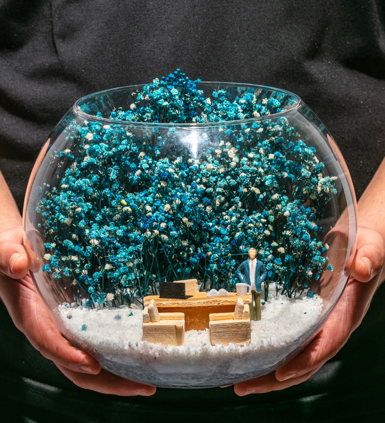 Orta boy açık cam fanus içerisinde hazırlanan bu özgün teraryum; beyaz kum, kurutulmuş bitkiler, bir adet mini ofis görseli ve bir adet çalışan erkeği simgeleyen objeyle birlikte kurgulanmıştır. Ev ve ofis ortamlarının tamamında sergilenebilir teraryumun içinde, kurutulmuş ve şoklanmış bitkiler bulunduğundan hava alması önemlidir. Açık olan kısmının kapatılmaması veya büfe vb. kapalı alanlara konulmaması gereklidir. Özellikle her ortamda zevkle izlenebilecek özel bir teraryumdur. Yaklaşık Ölçüler: 19x23 cm'dir.