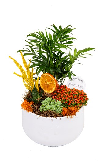Orta boy açık cam fanus içerisinde hazırlanan bu özgün teraryum; beyaz kum, kurutulmuş bitkiler, bir adet mini ofis görseli ve bir adet çalışan bayanı simgeleyen objeyle birlikte kurgulanmıştır. Ev ve ofis ortamlarının tamamında sergilenebilir teraryumun içinde, kurutulmuş ve şoklanmış bitkiler bulunduğundan hava alması önemlidir. Açık olan kısmının kapatılmaması veya büfe vb. kapalı alanlara konulmaması gereklidir. Özellikle her ortamda zevkle izlenebilecek özel bir teraryumdur. Yaklaşık Ölçüler: 19x23 cm'dir.
