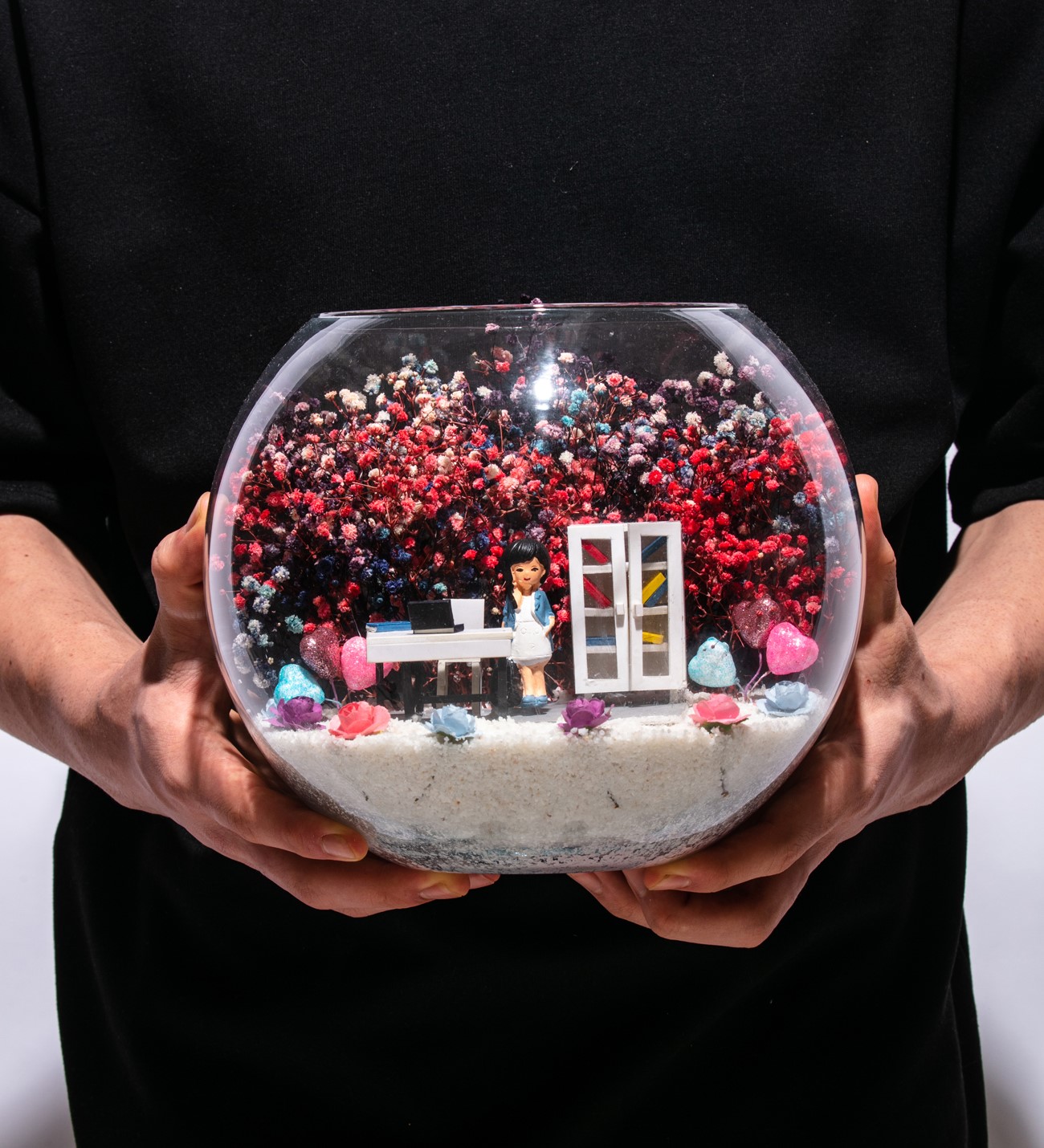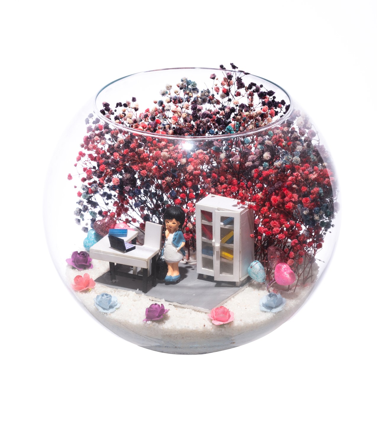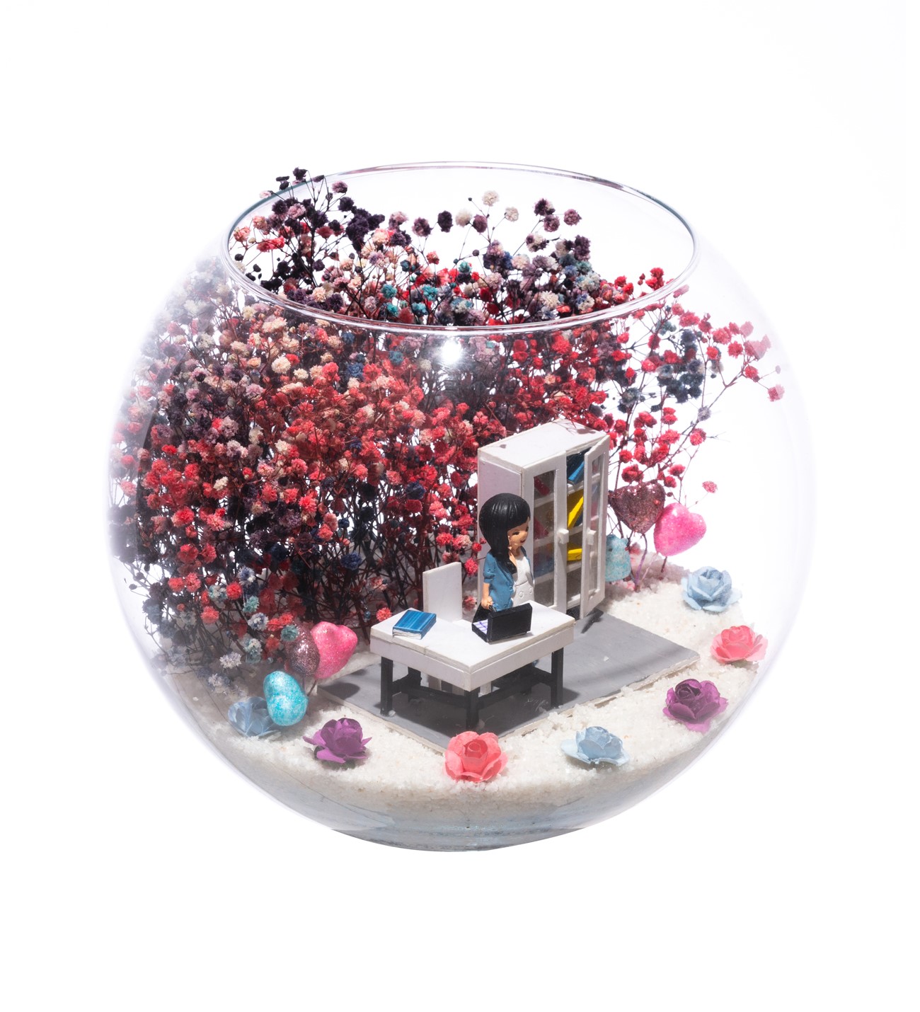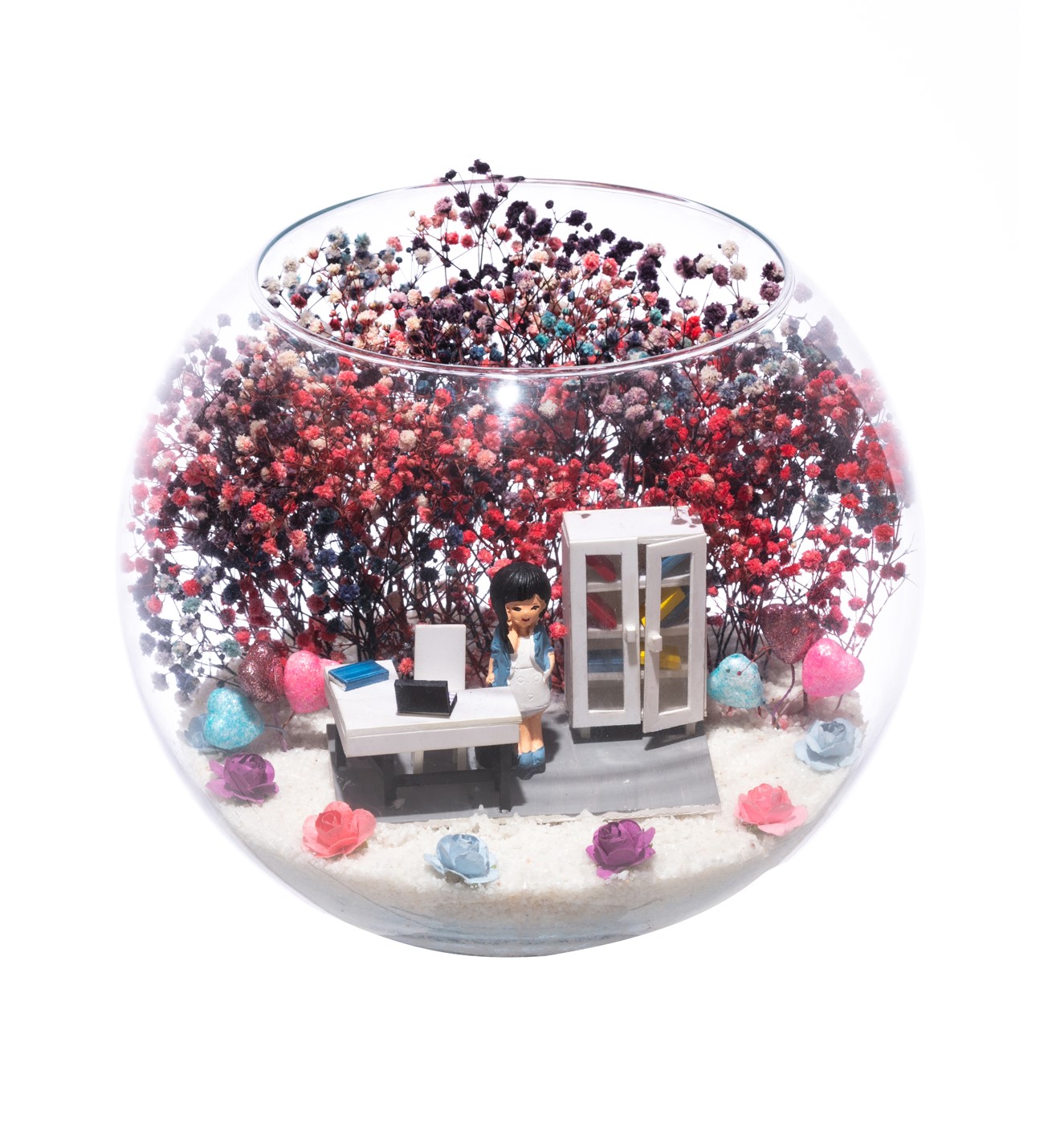 Orta boy açık cam fanus içerisinde hazırlanan, isminin hakkını veren bu özgün teraryum; beyaz kum, karışık renkli kurutulmuş bitkiler, renkli mini yapay güller, renkli simli kalpler, bir adet iş kadını görseli ve bir adet beyaz ahşap ofis ortamını simgeleyen objeler ile birlikte kurgulanmıştır. Ev ve ofis ortamlarının tamamında sergilenebilir teraryumun içinde, kurutulmuş ve şoklanmış bitkiler bulunduğundan hava alması önemlidir. Açık olan kısmının kapatılmaması veya büfe vb. kapalı alanlara konulmaması gereklidir. Özellikle her ortamda yıllarca, zevkle izlenebilecek özel bir teraryumdur. Yaklaşık Ölçüler: 19x23 cm'dir.