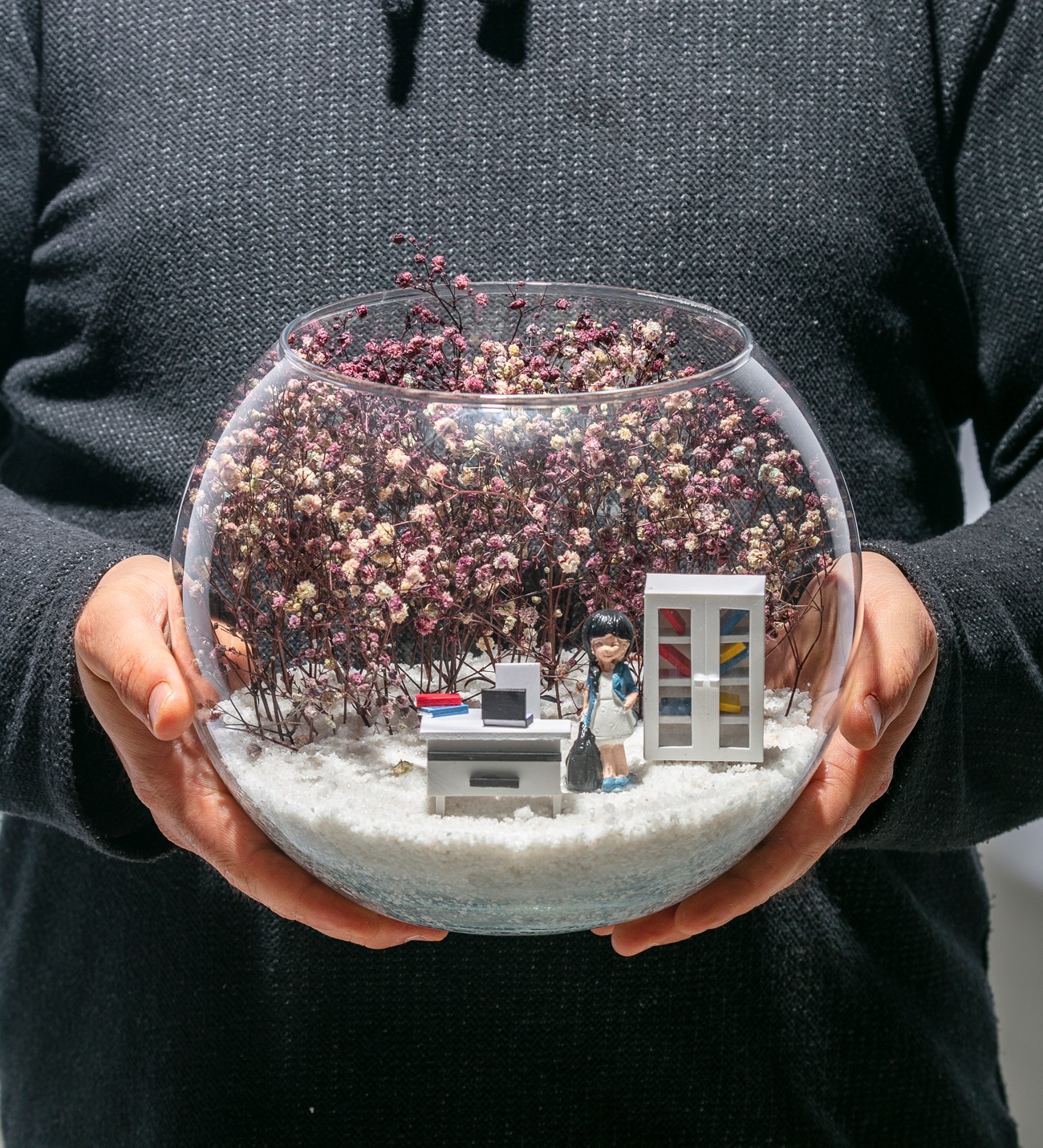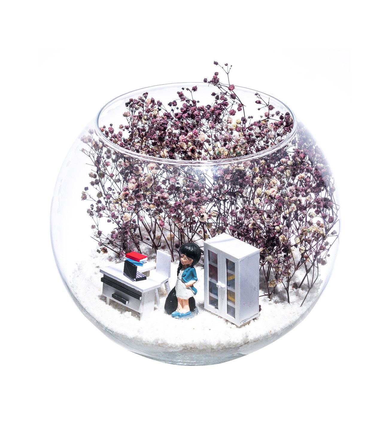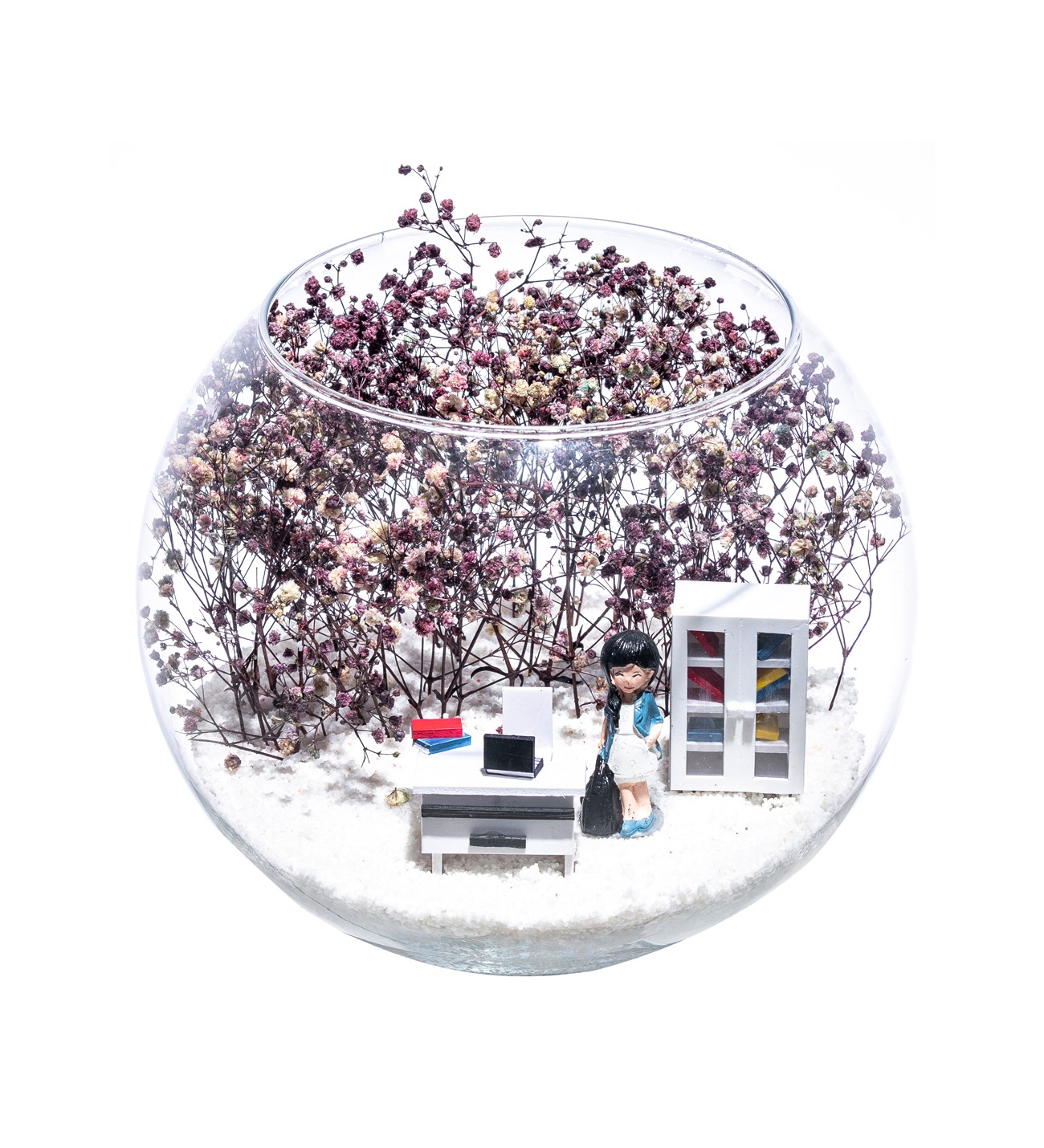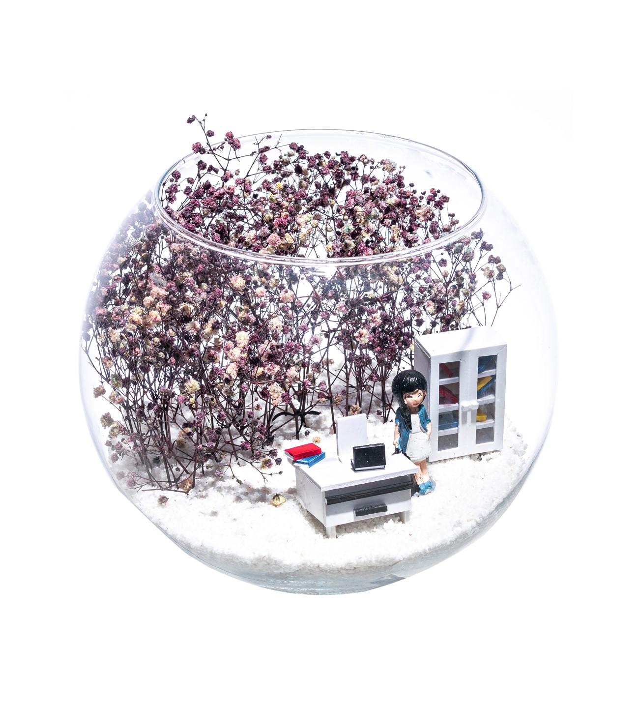 Orta boy açık cam fanus içerisinde hazırlanan, isminin hakkını veren bu özgün teraryum; beyaz kum, kurutulmuş bitkiler, bir adet içinde dosyalarıyla beyaz ofis dolabı, bir adet üzerinde bilgisayarı ile beyaz ofis masası ve bir adet elinde çantasıyla iş kadınını simgeleyen objeler ile birlikte kurgulanmıştır. Ev ve ofis ortamlarının tamamında sergilenebilir teraryumun içinde, kurutulmuş ve şoklanmış bitkiler bulunduğundan hava alması önemlidir. Açık olan kısmının kapatılmaması veya büfe vb. kapalı alanlara konulmaması gereklidir. Özellikle her ortamda yıllarca, zevkle izlenebilecek özel bir teraryumdur. Yaklaşık Ölçüler: 19x23 cm'dir.