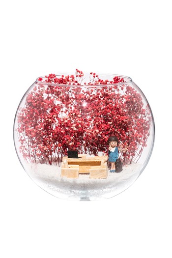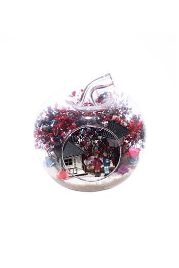 Küçük boy elma cam fanus içerisinde tasarladığımız bu kurdeleli teraryum, yeni işine başlayanları, gördükleri anda mutlu edecek şekilde tasarlandı. Tasarımımız; beyaz kum, kurutulmuş bitkilerle beraber bir adet mini ofis görseli ve bir adet erkek objeyle tamamlanmıştır. Ev ve ofis ortamlarının tamamında sergilenebilir teraryumun içinde, kurutulmuş bitkiler bulunduğundan hava alması önemlidir. Açık olan kısmının kapatılmaması veya büfe vb. kapalı alanlara konulmaması gereklidir. Özellikle her ortamda, zevkle izlenebilecek çok özel bir teraryumdur. Yaklaşık Ölçüleri: 20x20cm NOT: Teraryumlarda kullanılan camlar, üfleme cam işçiliğiyle üretildiğinden bazı detaylarda farklılıklar gözlenebilir. Örneğin, sap kısmı ve ağız bitiş noktalarının her biri kendine özgüdür.