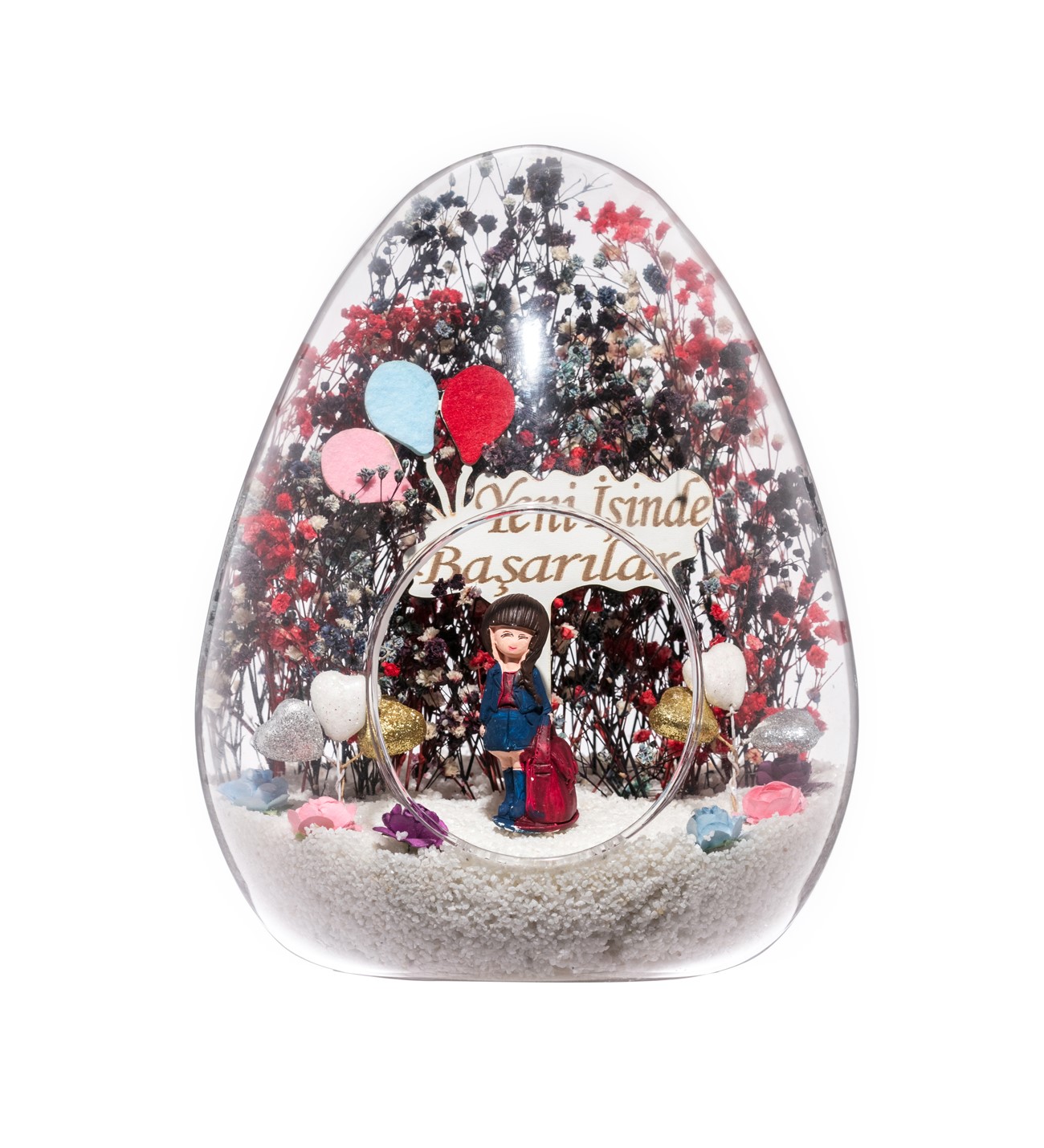 Küçük boy yumurta cam fanus içerisinde tasarladığımız bu özgün teraryum; beyaz kum, karışık renkli kurutulmuş bitkiler, renkli simli kalpler, renkli yapay mini güller, bir adet YENİ İŞİNDE BAŞARILAR yazılı ahşap balonlu tabela ve bayan obje kullanılarak tamamlanmıştır. Ev ve ofis ortamlarının tamamında sergilenebilir teraryumun içinde, kurutulmuş bitkiler olduğundan hava alması önemlidir. Açık olan kısmının kapatılmaması veya büfe vb. kapalı alanlara konulmaması gereklidir. Özellikle her ortamda, zevkle izlenebilecek özel bir teraryumdur. Yaklaşık Ölçüleri: 18x22cm NOT: Teraryumlarda kullanılan camlar, üfleme cam işçiliğiyle üretildiğinden bazı detaylarda farklılıklar gözlenebilir. Örneğin, ağız bitiş noktalarının her biri kendine özgüdür.