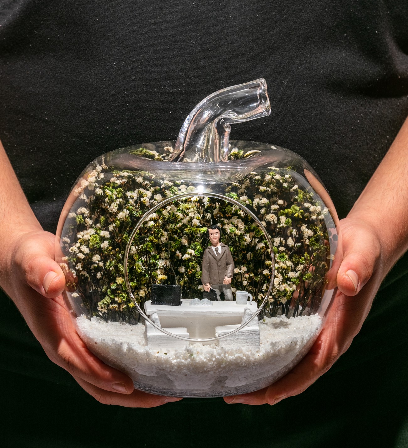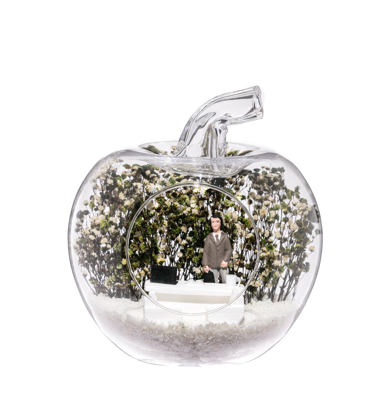 Küçük boy elma cam fanus içerisinde tasarladığımız bu teraryum, yeni işine başlayanları, gördükleri anda mutlu edecek şekilde tasarlandı. Tasarımımız; beyaz kum, kurutulmuş bitkilerle beraber bir adet mini ofis görseli ve bir adet erkek objeyle tamamlanmıştır. Ev ve ofis ortamlarının tamamında sergilenebilir teraryumun içinde, kurutulmuş bitkiler bulunduğundan hava alması önemlidir. Açık olan kısmının kapatılmaması veya büfe vb. kapalı alanlara konulmaması gereklidir. Özellikle her ortamda, zevkle izlenebilecek çok özel bir teraryumdur. Yaklaşık Ölçüleri: 20x20cm NOT: Teraryumlarda kullanılan camlar, üfleme cam işçiliğiyle üretildiğinden bazı detaylarda farklılıklar gözlenebilir. Örneğin, sap kısmı ve ağız bitiş noktalarının her biri kendine özgüdür.
