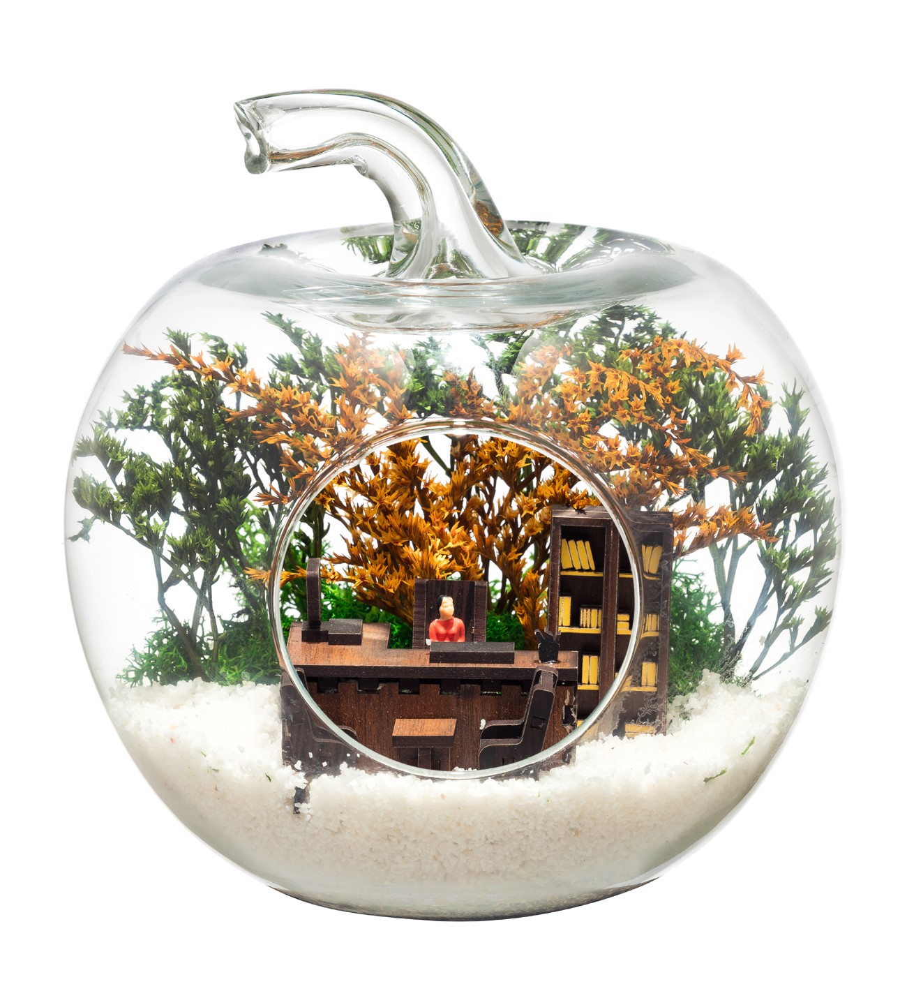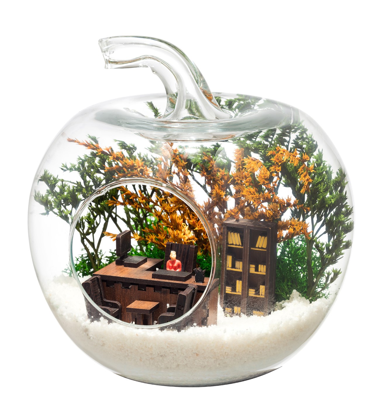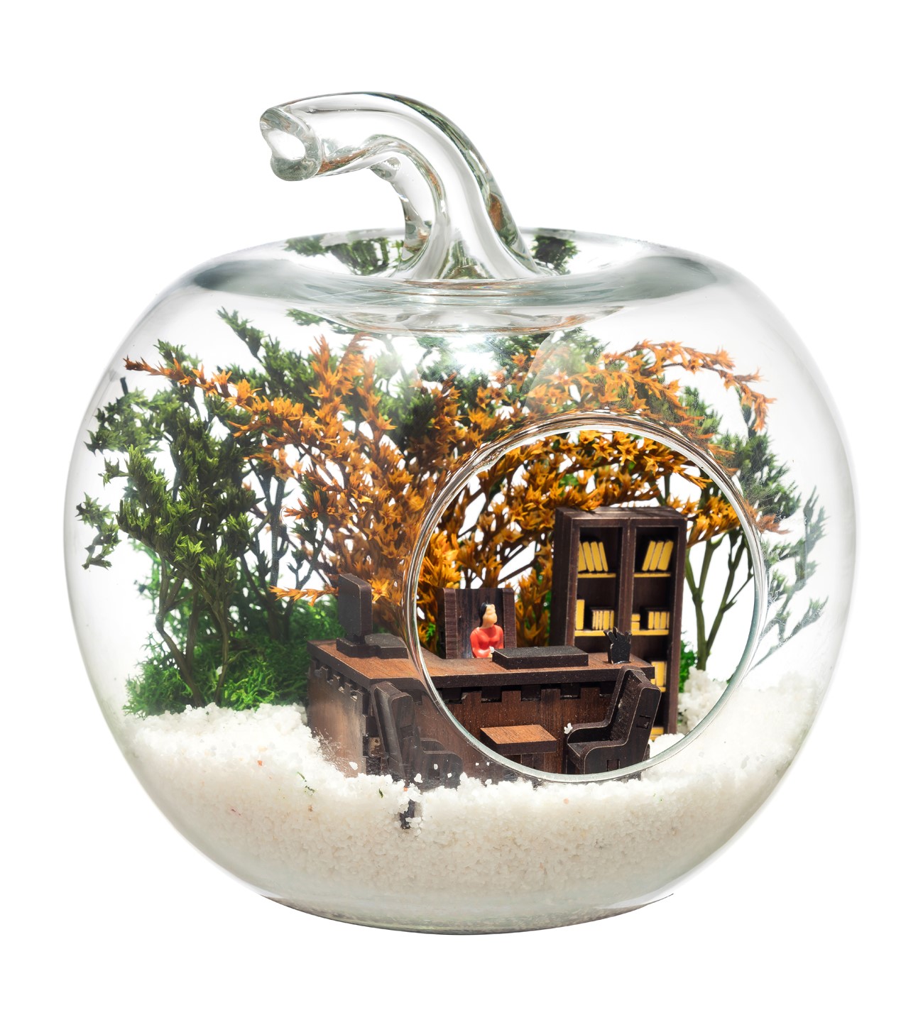 Güncel yaşamda yeni bir işe başlamak hem heyecan hem de beklentilerin yeniden gündeme gelmesidir. Sevdiğiniz kişilere, gönderilen ufak bir hediye bile o kişi için unutulmazlar arasında yer alacaktır. Bu anlamda görsel kazandırdığımız özgün tasarım teraryumu küçük elma cam içerisinde; bir ofis ortamı görseli, bir adet kadın obje, şoklanmış yosunlar ve kurutulmuş bitkilerle beraber beyaz kum üzerine sizler için kurguladık. Ev ve ofis ortamlarının tamamında sergilenebilir teraryumun içinde canlı bitki bulunmadığından, herhangi bir bakıma ihtiyacı yoktur. Özellikle her ortamda yıllarca, zevkle izlenebilecek çok özel bir teraryumdur. Yaklaşık Ölçüler: 20×20 cm