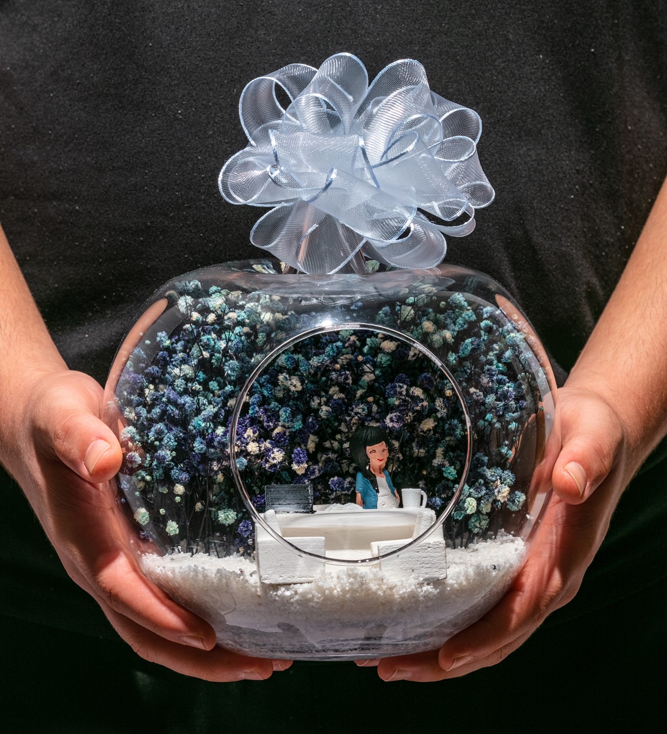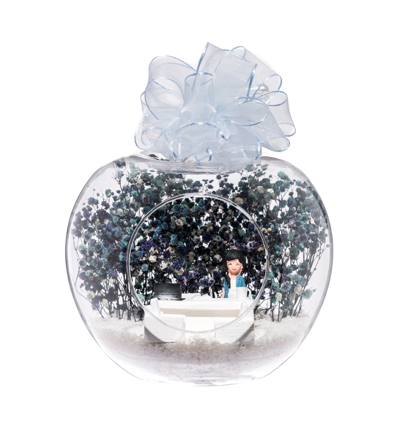 Küçük boy elma cam fanus içerisinde tasarladığımız bu kurdeleli teraryum, yeni işine başlayanları, gördükleri anda mutlu edecek şekilde tasarlandı. Tasarımımız; beyaz kum, kurutulmuş bitkilerle beraber bir adet mini ofis görseli ve bir adet bayan objeyle tamamlanmıştır. Ev ve ofis ortamlarının tamamında sergilenebilir teraryumun içinde, kurutulmuş bitkiler bulunduğundan hava alması önemlidir. Açık olan kısmının kapatılmaması veya büfe vb. kapalı alanlara konulmaması gereklidir.. Özellikle her ortamda, zevkle izlenebilecek çok özel bir teraryumdur. Yaklaşık Ölçüleri: 20x20cm NOT: Teraryumlarda kullanılan camlar, üfleme cam işçiliğiyle üretildiğinden bazı detaylarda farklılıklar gözlenebilir. Örneğin, sap kısmı ve ağız bitiş noktalarının her biri kendine özgüdür.
