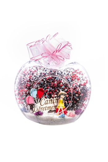 Küçük boy elma cam fanus içerisinde tasarladığımız bu kurdeleli teraryum, yeni işine başlayanları, gördükleri anda mutlu edecek şekilde tasarlandı. Tasarımımız; beyaz kum, kurutulmuş bitkilerle beraber bir adet mini ofis görseli ve bir adet bayan objeyle tamamlanmıştır. Ev ve ofis ortamlarının tamamında sergilenebilir teraryumun içinde, kurutulmuş bitkiler bulunduğundan hava alması önemlidir. Açık olan kısmının kapatılmaması veya büfe vb. kapalı alanlara konulmaması gereklidir.. Özellikle her ortamda, zevkle izlenebilecek çok özel bir teraryumdur. Yaklaşık Ölçüleri: 20x20cm NOT: Teraryumlarda kullanılan camlar, üfleme cam işçiliğiyle üretildiğinden bazı detaylarda farklılıklar gözlenebilir. Örneğin, sap kısmı ve ağız bitiş noktalarının her biri kendine özgüdür.