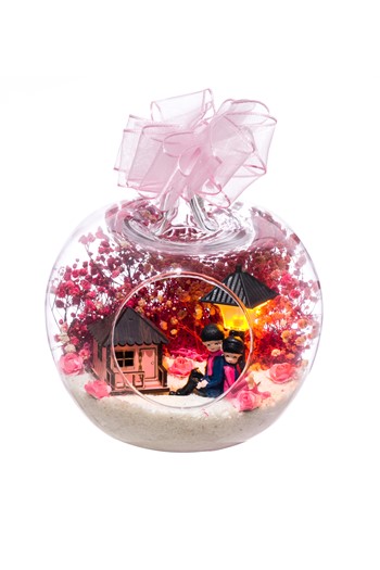 Küçük boy elma cam fanus içerisinde tasarladığımız bu kurdeleli teraryum, yeni işine başlayanları, gördükleri anda mutlu edecek şekilde tasarlandı. Tasarımımız; beyaz kum, kurutulmuş bitkilerle beraber bir adet mini ofis görseli ve bir adet bayan objeyle tamamlanmıştır. Ev ve ofis ortamlarının tamamında sergilenebilir teraryumun içinde, kurutulmuş bitkiler bulunduğundan hava alması önemlidir. Açık olan kısmının kapatılmaması veya büfe vb. kapalı alanlara konulmaması gereklidir.. Özellikle her ortamda, zevkle izlenebilecek çok özel bir teraryumdur. Yaklaşık Ölçüleri: 20x20cm NOT: Teraryumlarda kullanılan camlar, üfleme cam işçiliğiyle üretildiğinden bazı detaylarda farklılıklar gözlenebilir. Örneğin, sap kısmı ve ağız bitiş noktalarının her biri kendine özgüdür.