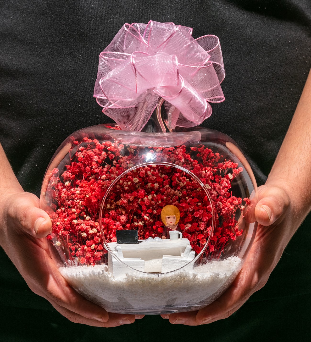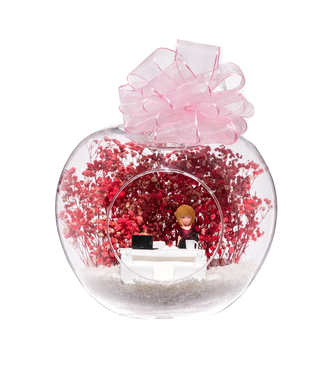 Küçük boy elma cam fanus içerisinde tasarladığımız bu kurdeleli teraryum, yeni işine başlayanları, gördükleri anda mutlu edecek şekilde tasarlandı. Tasarımımız; beyaz kum, kurutulmuş bitkilerle beraber bir adet mini ofis görseli ve bir adet bayan objeyle tamamlanmıştır. Ev ve ofis ortamlarının tamamında sergilenebilir teraryumun içinde, kurutulmuş bitkiler bulunduğundan hava alması önemlidir. Açık olan kısmının kapatılmaması veya büfe vb. kapalı alanlara konulmaması gereklidir.. Özellikle her ortamda, zevkle izlenebilecek çok özel bir teraryumdur. Yaklaşık Ölçüleri: 20x20cm NOT: Teraryumlarda kullanılan camlar, üfleme cam işçiliğiyle üretildiğinden bazı detaylarda farklılıklar gözlenebilir. Örneğin, sap kısmı ve ağız bitiş noktalarının her biri kendine özgüdür.