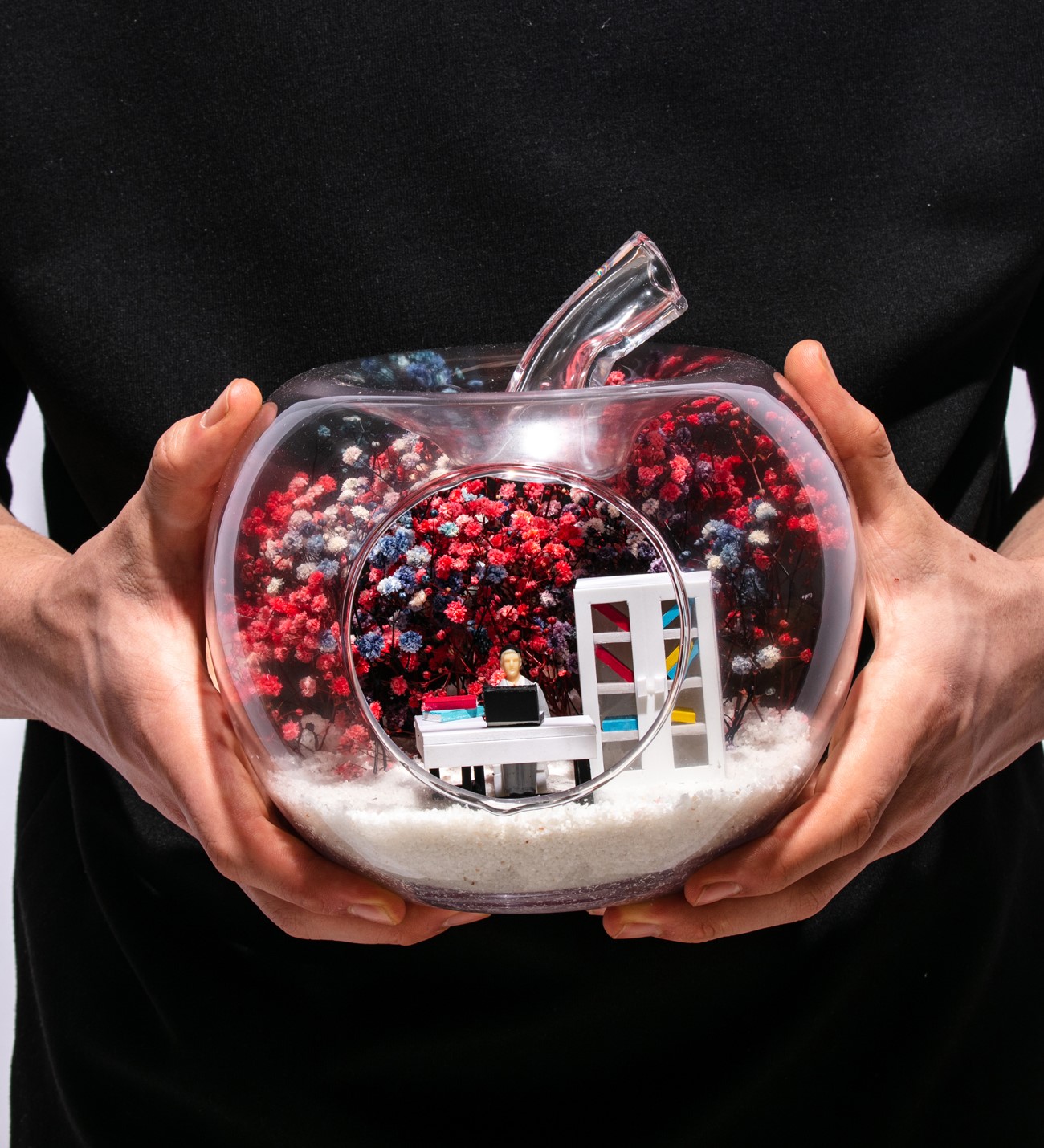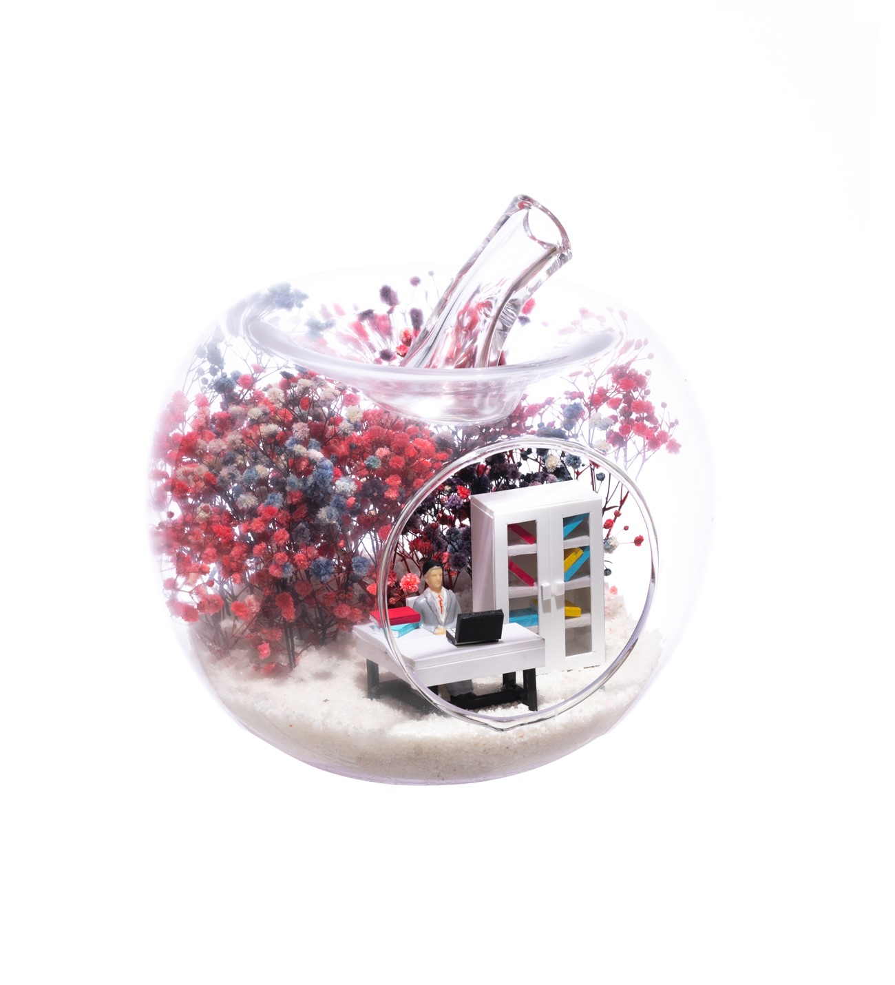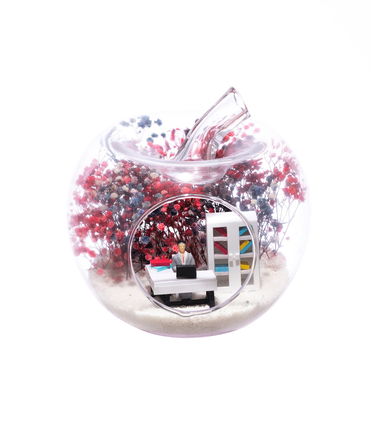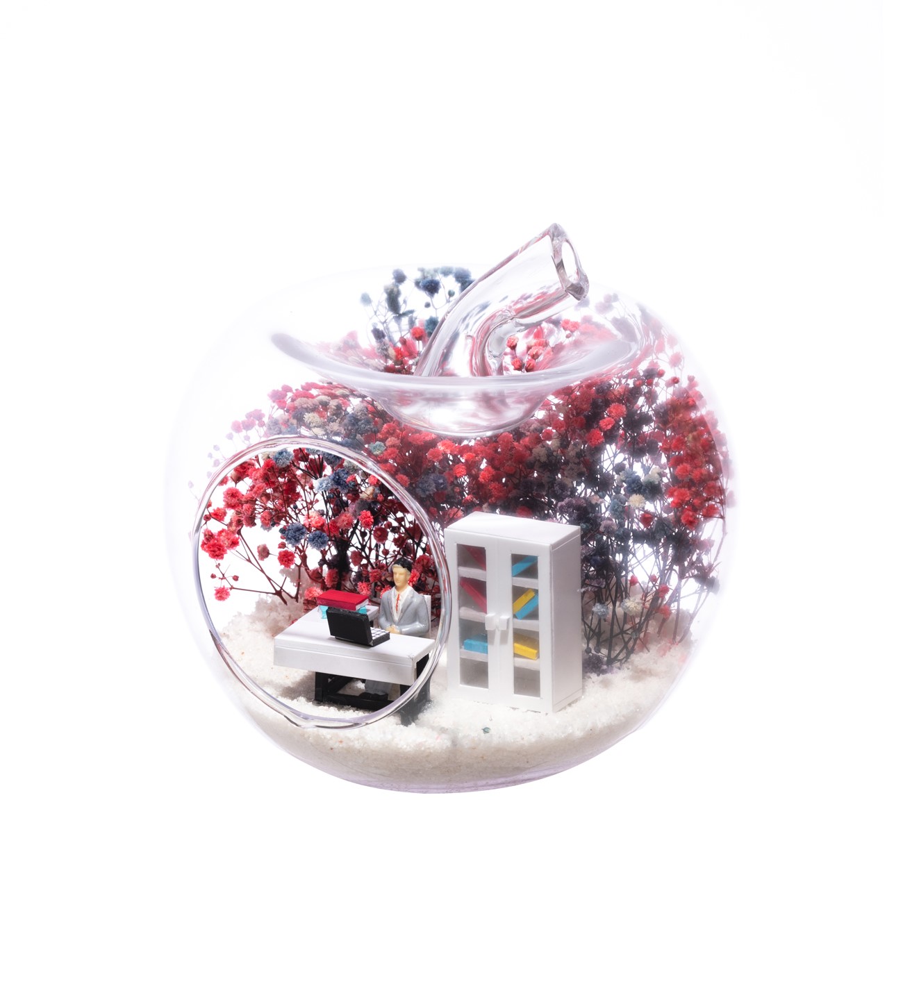 Küçük boy elma cam fanus içerisinde tasarladığımız bu çok güzel teraryum; beyaz kum, karışık renkli kurutulmuş bitkiler, bir adet ofis dolabı, bir adet üzerinde bilgisayarı ve sandalyesinde oturan erkek çalışanı ile ofis masası görseli kullanılarak tamamlanmıştır. Ev ve ofis ortamlarının tamamında sergilenebilir teraryumun içinde, kurutulmuş bitkiler bulunduğundan hava alması önemlidir. Açık olan kısmının kapatılmaması veya büfe vb. kapalı alanlara konulmaması gereklidir. Özellikle her ortamda yıllarca, zevkle izlenebilecek özel bir teraryumdur. Yaklaşık Ölçüleri: 20x20cm NOT: Teraryumlarda kullanılan camlar, üfleme cam işçiliğiyle üretildiğinden bazı detaylarda farklılıklar gözlenebilir. Örneğin, sap kısmı ve ağız bitiş noktalarının her biri kendine özgüdür.