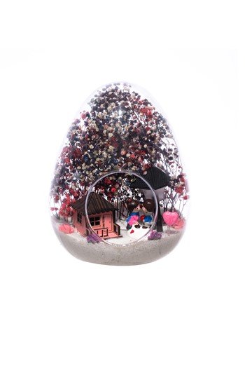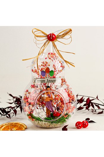 Küçük boy elma cam fanus içerisinde tasarladığımız bu çok güzel teraryum; beyaz kum, karışık renkli kurutulmuş bitkiler, bir adet ofis dolabı, bir adet üzerinde bilgisayarı ve sandalyesinin yanında vizon takım elbisesiyle erkek çalışanı ve ofis masası görseli kullanılarak tamamlanmıştır. Ev ve ofis ortamlarının tamamında sergilenebilir teraryumun içinde, kurutulmuş bitkiler bulunduğundan hava alması önemlidir. Açık olan kısmının kapatılmaması veya büfe vb. kapalı alanlara konulmaması gereklidir. Özellikle her ortamda yıllarca, zevkle izlenebilecek özel bir teraryumdur. Yaklaşık Ölçüleri: 20x20cm NOT: Teraryumlarda kullanılan camlar, üfleme cam işçiliğiyle üretildiğinden bazı detaylarda farklılıklar gözlenebilir. Örneğin, sap kısmı ve ağız bitiş noktalarının her biri kendine özgüdür.