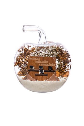 Kurdele ile tamamlanmış küçük boy elma cam fanus içerisinde tasarladığımız bu çok güzel teraryum; beyaz kum, şoklanmış yosunlar, kurutulmuş bitkiler, yapay güller, iki adet simli kalp ve bir ördeğin taşıdığı erkek bebeği simgeleyen objelerle tamamlanmıştır. Ev ve ofis ortamlarının tamamında sergilenebilir teraryumun içinde, kurutulmuş ve şoklanmış bitkiler bulunduğundan hava alması önemlidir. Açık olan kısmının kapatılmaması veya büfe vb. kapalı alanlara konulmaması gereklidir. Özellikle her ortamda yıllarca, zevkle izlenebilecek özel bir teraryumdur. Yaklaşık Ölçüleri: 20x20cm NOT: Teraryumlarda kullanılan camlar, üfleme cam işçiliğiyle üretildiğinden bazı detaylarda farklılıklar gözlenebilir. Örneğin, sap kısmı ve ağız bitiş noktalarının her biri kendine özgüdür.