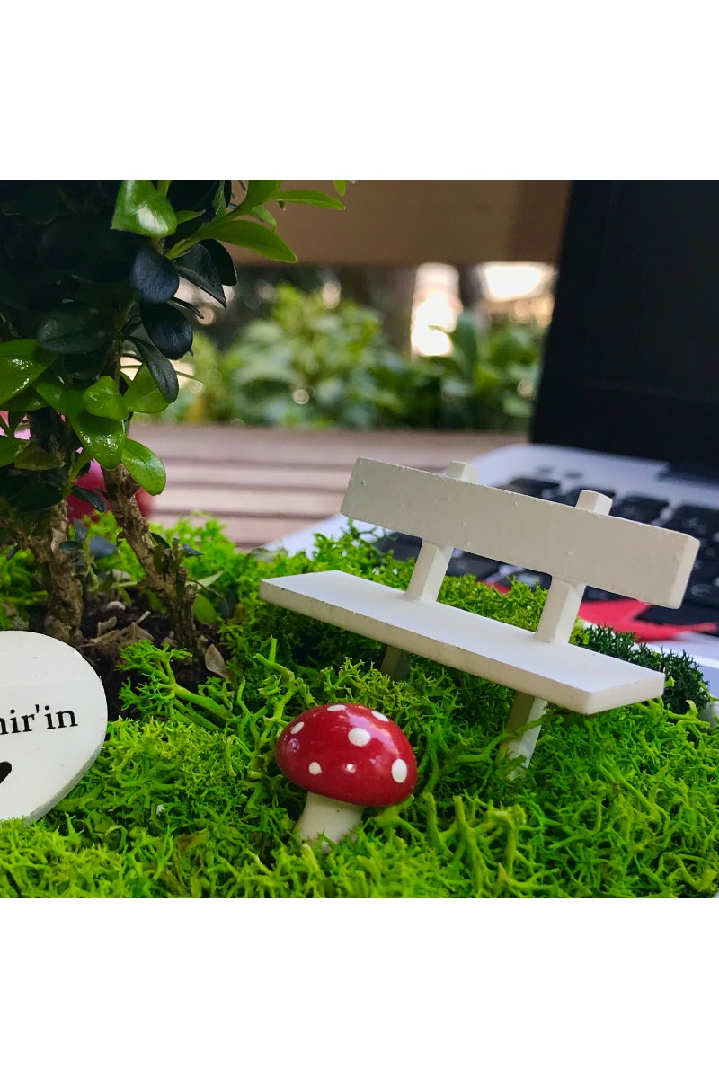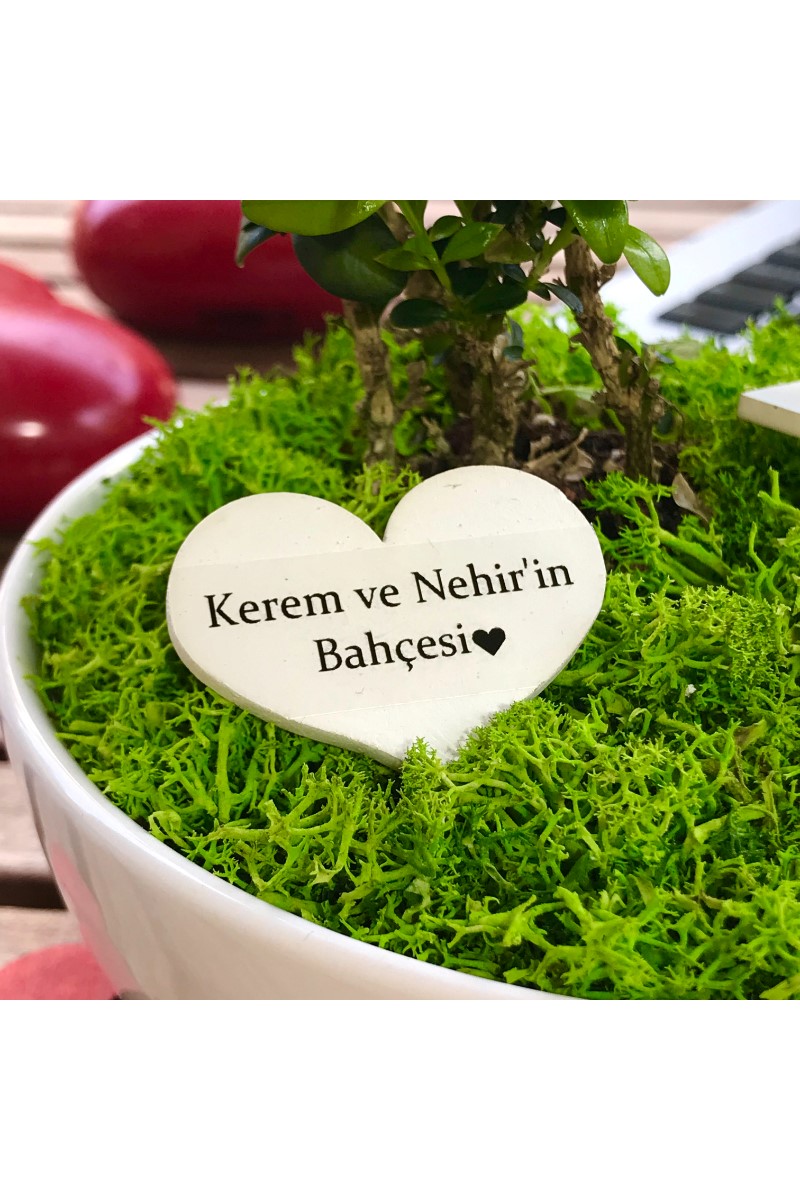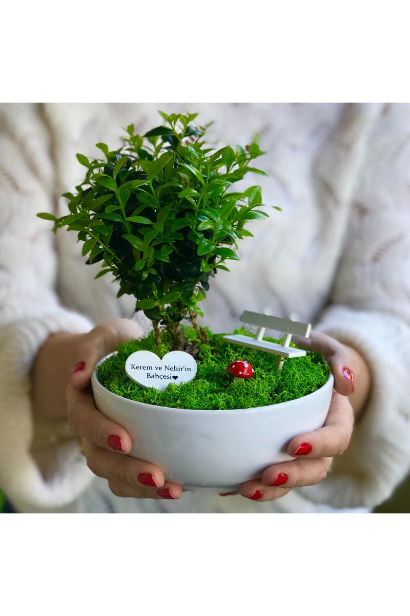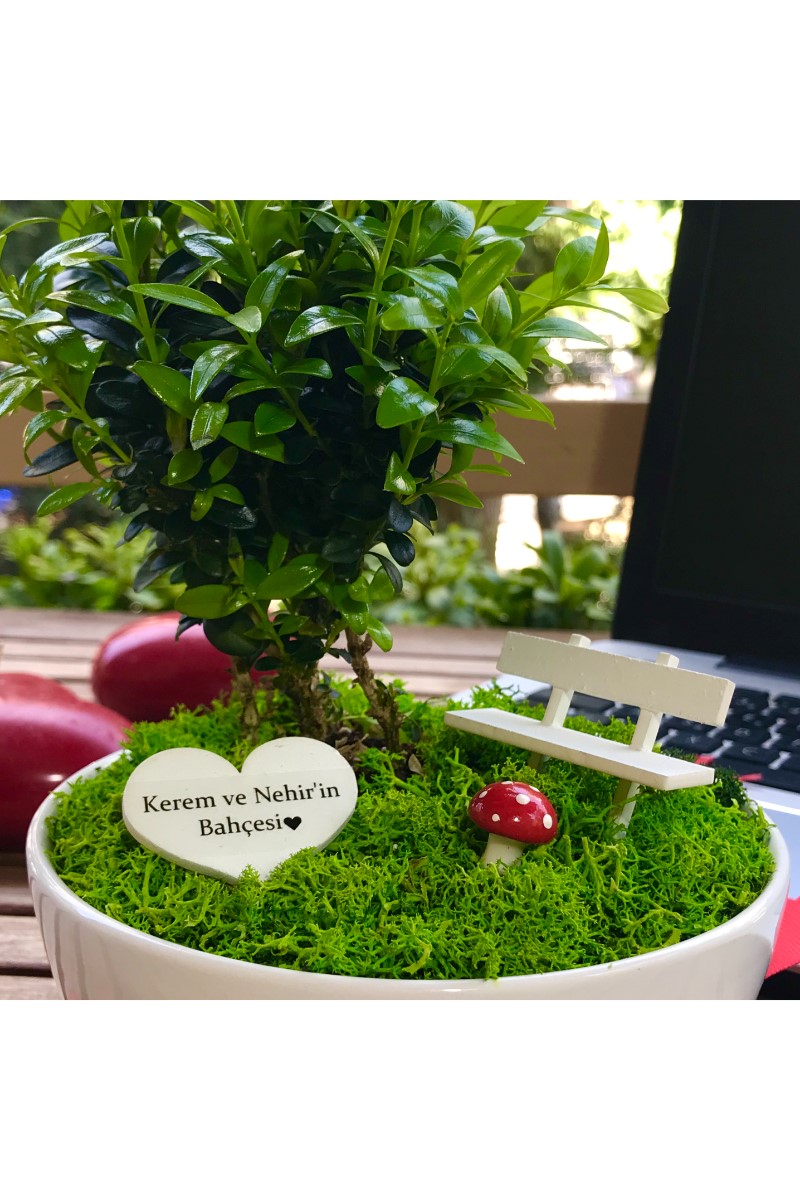Kişiye Özel Sevgilimin Kalpli Bonsai Bahçesi Bu orijinal tasarım yıllarca unutulmayacak eşsiz bir hediye arayanlar için canlı bitkiler ve ahşap mobilyalarla hazırlanmıştır. El emeği ile üretilen şeyler her zaman özeldir. Minyatür bahçeniz, sevdiklerinizin gününü güzelleştirmek için özenle seçilen bitkiler ve tek tek elde hazırlanan aksesuarlarla tamamlanır. Minyatür bahçe, yaklaşık 13 cm çapında 6 cm yüksekliğinde benzer formdaki porselen ya da seramik kaplarda Buxus Sempervirens türü bitki ile hazırlanır. Bahçede el yapımı ahşap bank, ahşap sehpa ve üzerinde el yapımı minyatür kitap The Book of Love (Aşkın Kitabı) bulunmaktadır. Zarif hediyeniz, Kişiye Özel hazırlanan şık bir bahçe kalpli tabelası ile tamamlanmaktadır. Büyük bölümü tek tek elde hazırlanan minyatür aksesuarların tasarımlarında değişiklikler ya da milimetrik ölçü farklılıkları bulunabilir. Bakım: Minyatür bitki canlıdır. Bol gün ışığı alan dış mekanlar için uygundur. Minyatür bahçenin zemininde canlı ya da şoklanmış yosun kullanılır. Yosunlar zamanla renk ve dokularını kaybedebilir.